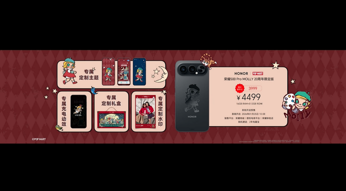 荣耀500 Pro MOLLY 20 周年限定版是与泡泡玛特联名的全机定制潮玩手机,机身印 MOLLY小画家形象,系统有专属主题、壁纸等。16GB+512GB 版本,售价 4499 元,国补后 3999 元。