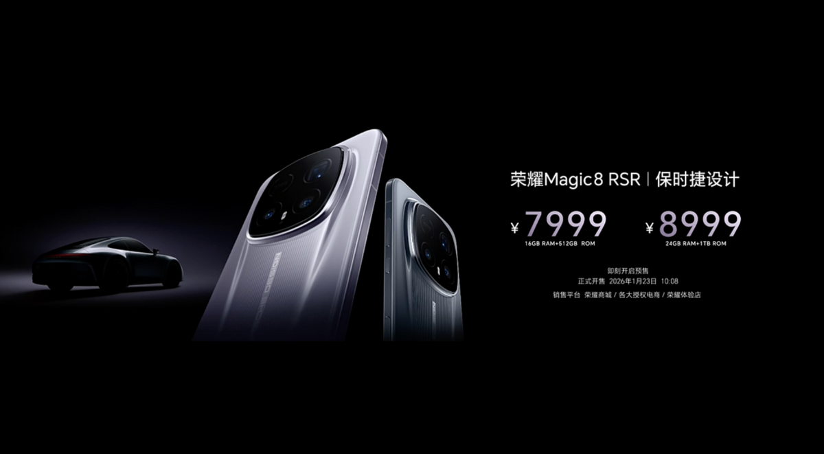 荣耀Magic8 RSR 保时捷设计定位高端,融入保时捷超跑元素:“流光飞线” 机身、911 大灯造型镜头,配圆润方形相机模块与月光石等配色。配置上有第五代骁龙 8 至尊版、2 亿像素超夜神长焦、7200mAh 青海湖电池+120W快充,售价7999元起。