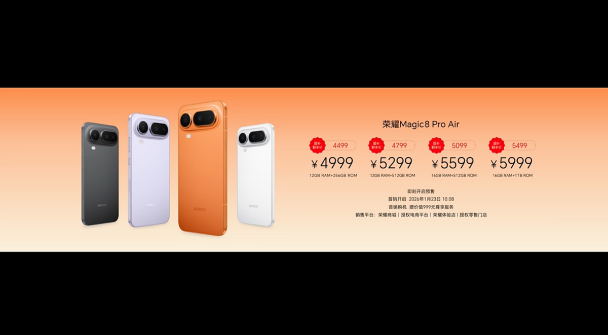 1月19日,荣耀在珠海举办新品发布会,推出荣耀Magic8 Pro Air、荣耀Magic8 RSR 保时捷设计及荣耀500 Pro MOLLY 20 周年限定版三款产品,覆盖不同消费需求,完善产品矩阵。