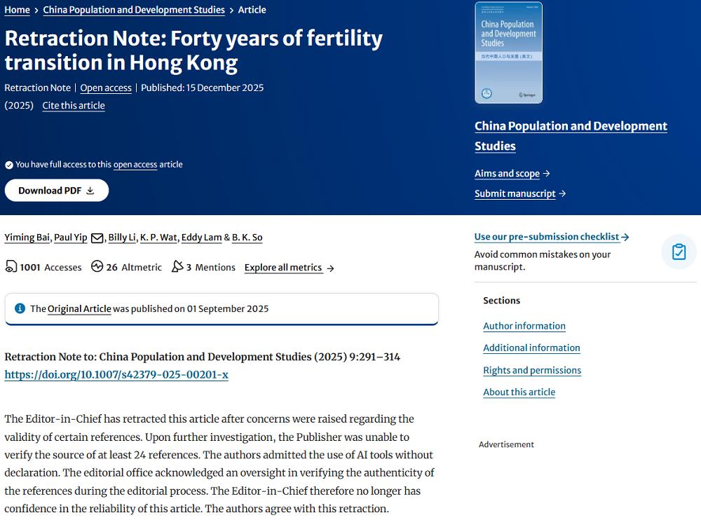 声明中写道,《当代中国人口与发展》主编在对某些引用有效性提出疑虑后,撤回了本文。经过进一步调查,出版商未能核实至少24条参考文献的来源。