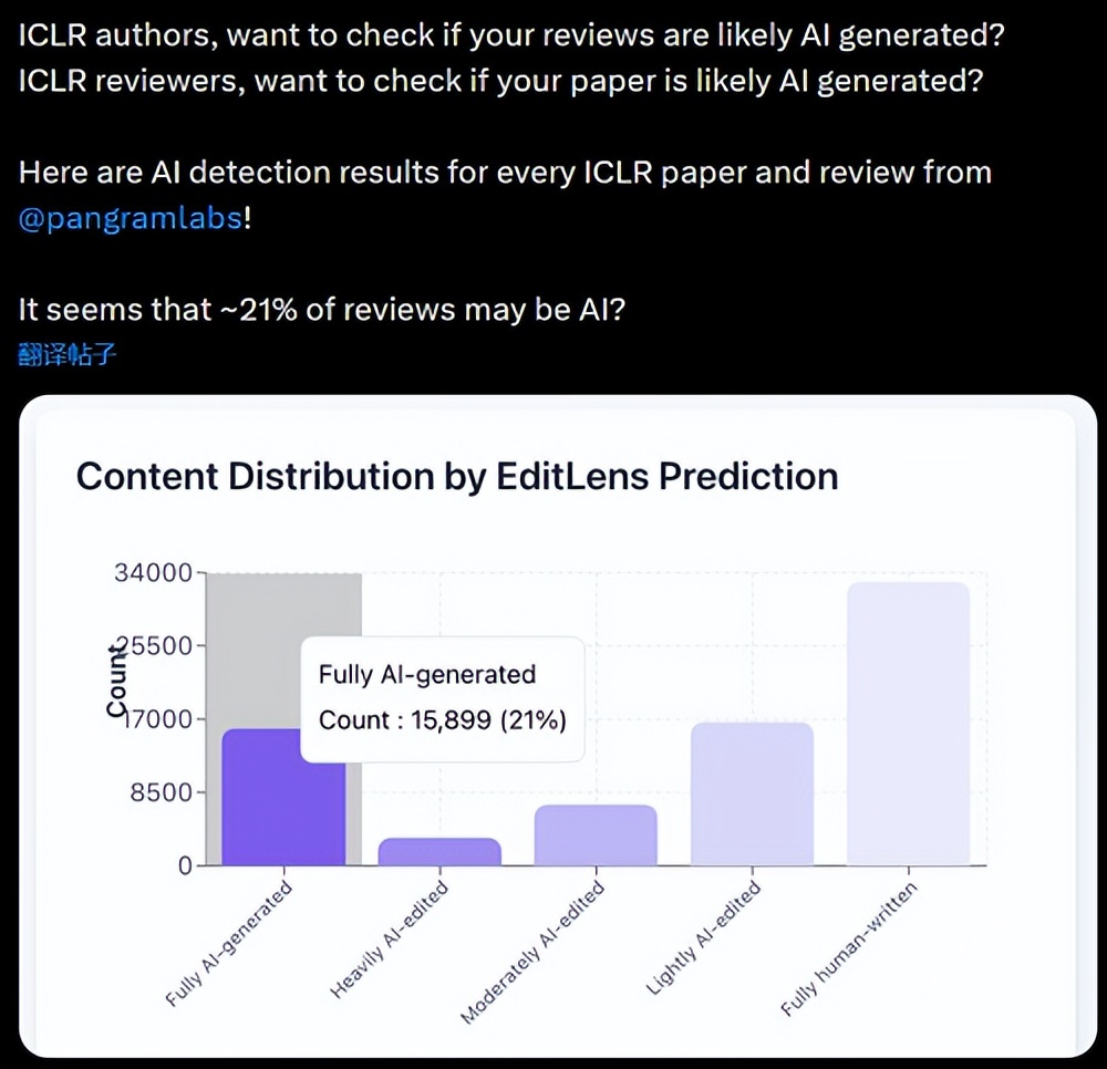 2025年,AI圈顶会NeuralPS、ICLR等也因审稿人使用AI辅助而饱受争议。研究机构Program Labs对ICLR 2026的7.58万篇论文的审稿意见进行了统计和分析,结果显示,其中有21%完全由AI生成,36%由AI进行大幅编辑,仅有43%的审稿意见完全由人类撰写。