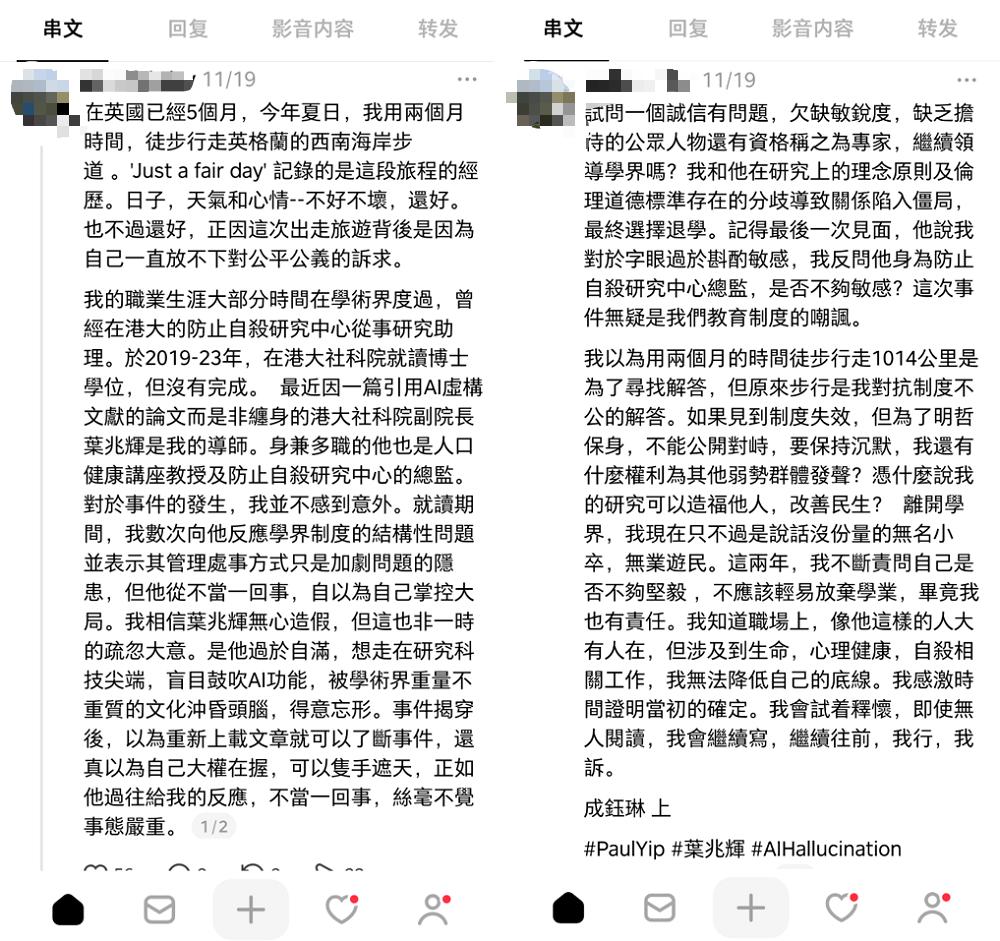 原爆料者在事件热度飙升后,实名披露了更多细节。她发文称,自己曾于2019年-2023年在香港大学社科院修读博士学位,导师正是叶兆辉,但并未完成学业。