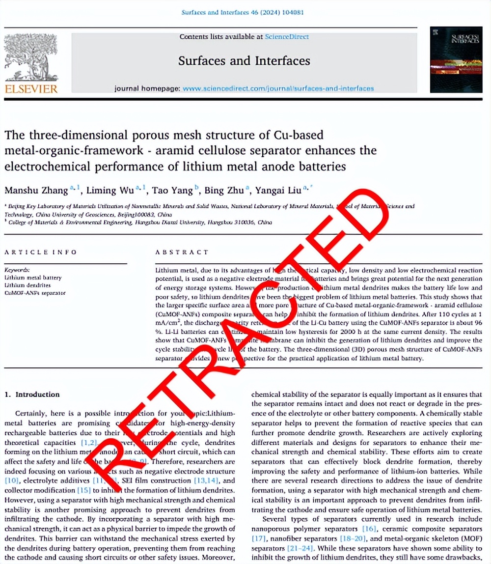 比如,2024年3月,发表于SCI期刊《表面与界面(Surfaces and Interfaces)》的一项关于锂电池的研究,就出现了明显的AI生成内容。该论文第一页的引文部分第一句话写道:“没问题,以下是一个可供参考的主题引言(Certainly,here is a possible introduction for your topic)。”