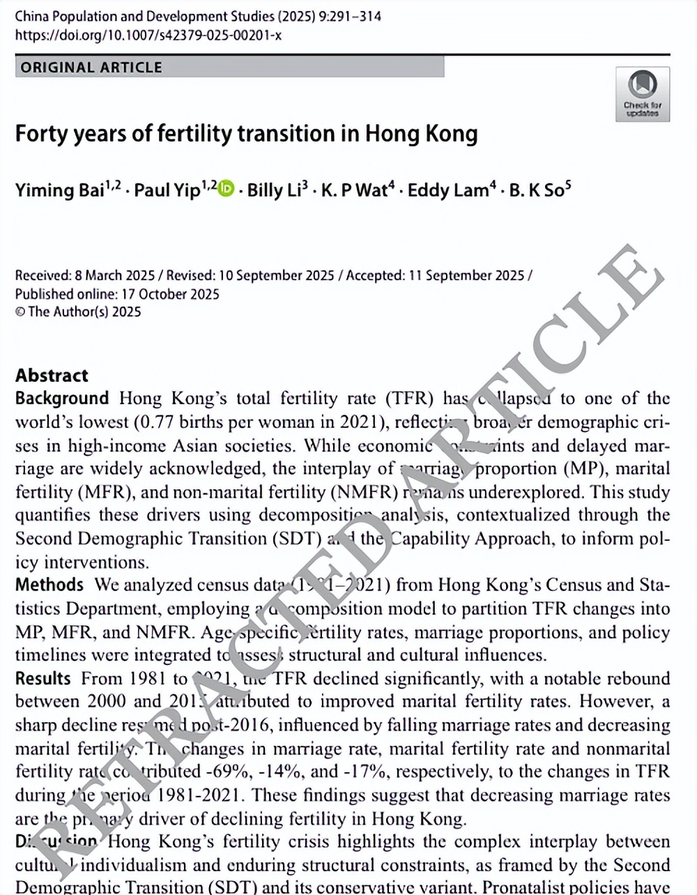 涉事论文名为《香港40年生育率转变(Forty years of fertility transition in Hong Kong)》,第一作者是香港大学社会行政与工作系博士生白逸铭,通讯作者则是其导师叶兆辉。其他作者包括来自香港大学、暨南大学和香港政府统计处的教授、讲师与研究员。