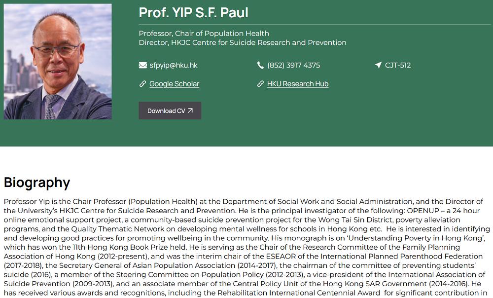 叶兆辉是我国社会科学领域颇具影响力的学者,在香港大学社会工作及社会行政学系担任讲席教授(级别最高),主要研究人口健康、自杀预防等学术议题,发表了700多篇相关论文。