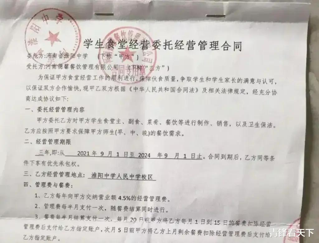 或许有人会说,财政部、教育部规定中小学食堂须坚持公益性、非营利性原则,伙食费应全部用于供餐成本的规定,是在2022年才下发。淮阳人民中学学生食堂经营管理合同签订时,这些规定尚未公开。但从相关规定公开到现在,时间也过去了两年多,经营管理者为何没有在规定明确后,和校方商谈,依照相关规定,修改经营管理合同?