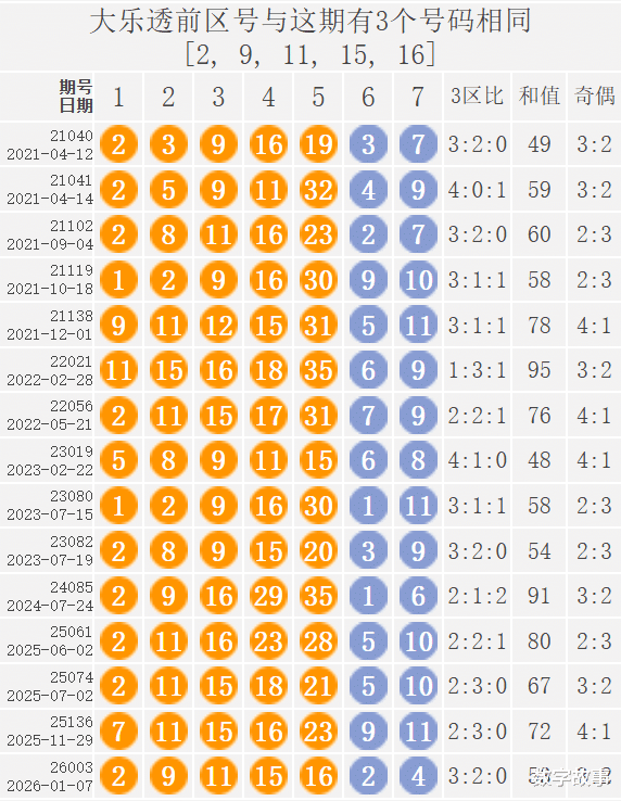 大乐透26003期前区号在过去是否出现过?大乐透26003期前区号: 2-9-11-15-16经查,历史上没有出现过与这一期5个前区号或者4个前区号一样的。与这一期3个前区号一样的有39期,取近15期如下: