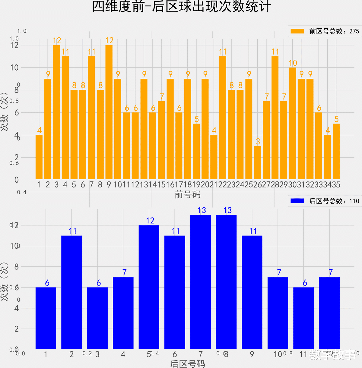 => 统计出现概率综合以上4个纬度的号码,共55期根据出现次数,分为热号,冷号,其他的为温号。统计样本数据: 275个前区号码 110个后区号码