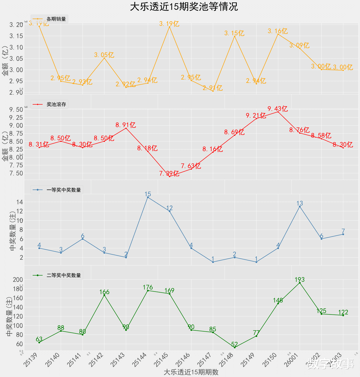 大乐透26003期一等奖:7注,追加: 4注二等奖:122注,追加: 35注。本期全国销售金额:2.997 亿 奖池滚存:8.296 亿.近15期奖池滚存, 中奖情况等信息:
