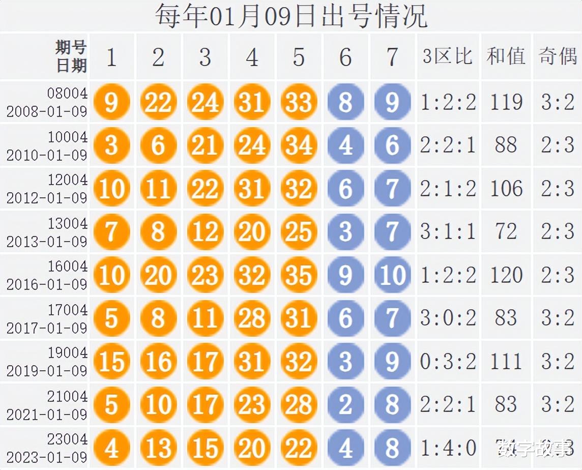 大乐透历史上的今天2026-01-09 星期五 大乐透不开奖每年01月09日出号情况: