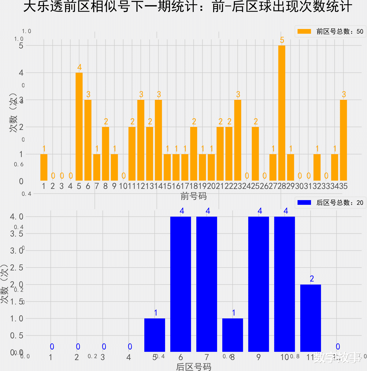 大乐透近10期前后区号统计情况统计样本数据: 50个前区号码 20个后区号码