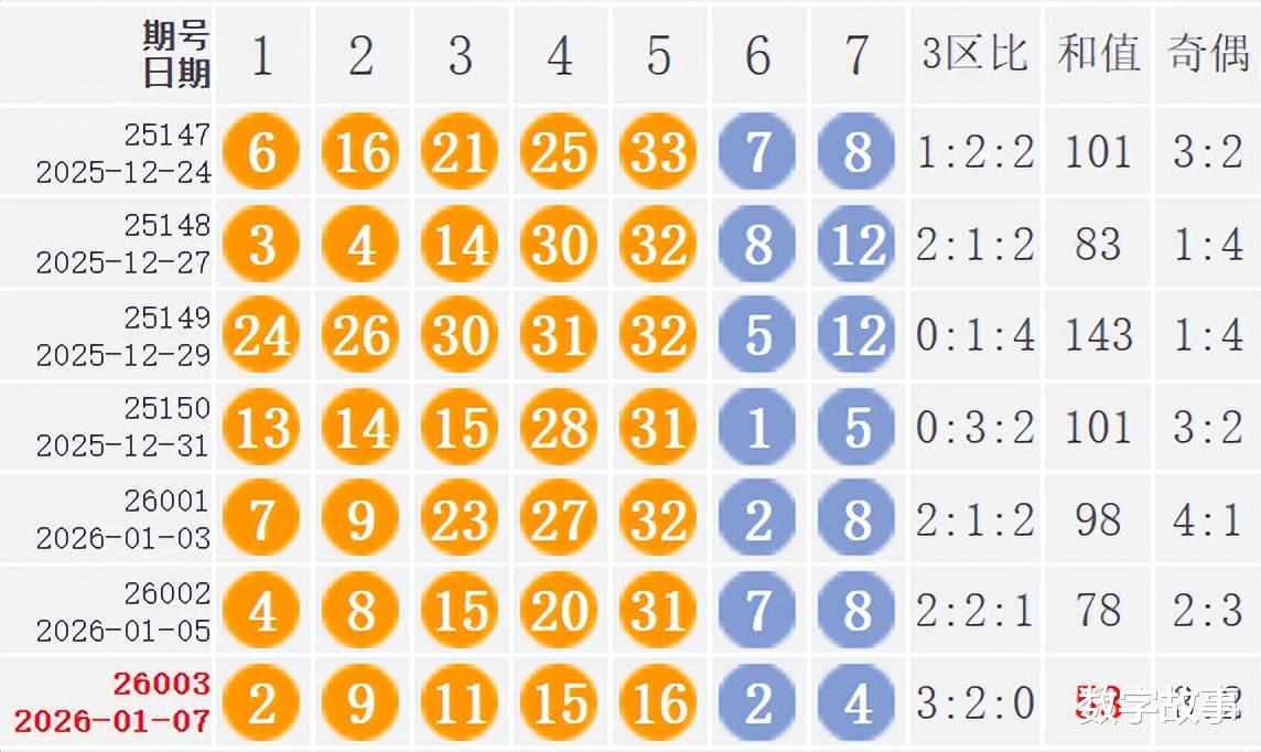 大乐透26003期开奖结果及中奖情况:出奖时间: 2026-01-07 星期三 前区号:2-9-11-15-16后区号:2-4大乐透前区重号叠码:15前区隔期下落:9后区隔期下落:2大乐透前区奇偶比:3:2 前区和值:53前区跨度:14 三区比:3:2:0连号: 15-16