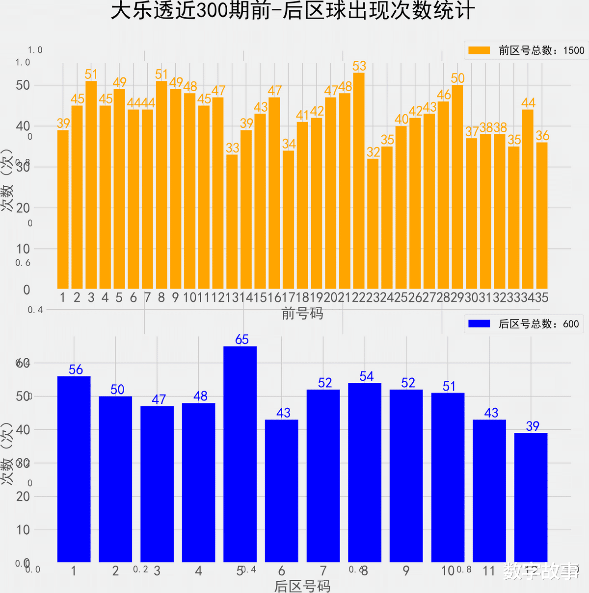 大乐透近300期前后区号统计情况统计样本数据: 1500个前区号码 600个后区号码