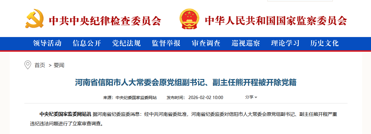 中央纪委国家监委网站讯据河南省纪委监委消息:经中共河南省委批准,河南省纪委监委对信阳市人大常委会原党组副书记、副主任熊开程严重违纪违法问题进行了立案审查调查。