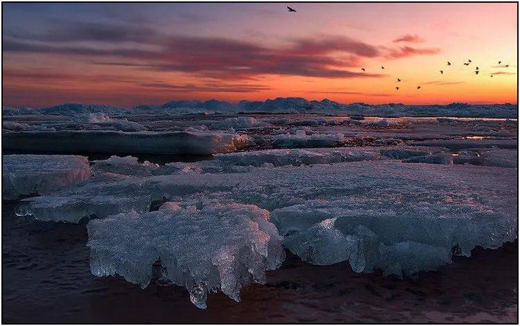 冰凌漂流,好像是世界的尽头,但远处飞翔的鸟群又给这里增加了许多生机。