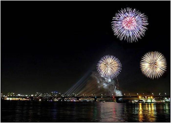 三朵烟花绽放在江水上空,照射灯都无法到达的高度。