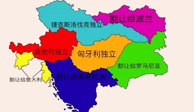 1918年第一次世界大战结束后奥匈帝国解体:奥地利、匈牙利、捷克斯洛伐克独立;斯洛文尼亚、克罗地亚与塞尔维亚合并;蒂罗尔州并入意大利;伏伊伏丁那并入塞尔维亚-克罗地亚-斯洛文尼亚王国;特兰西瓦尼亚并入罗马尼亚;加利西亚并入波兰。1866年以前奥地利帝国的领土面积约为65万平方公里;1918年以后奥地利只剩下83879平方公里。奥地利失去了昔日87%左右的领土。在这一过程中奥地利失去了全部海岸线变成了一个内陆国。