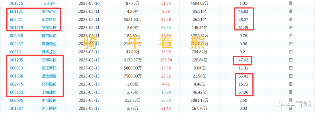 3月13日(周五)联特科技解禁比例达到47.62%;通达创智解禁比例达到66.41%;上海建科解禁比例达到67.06%。