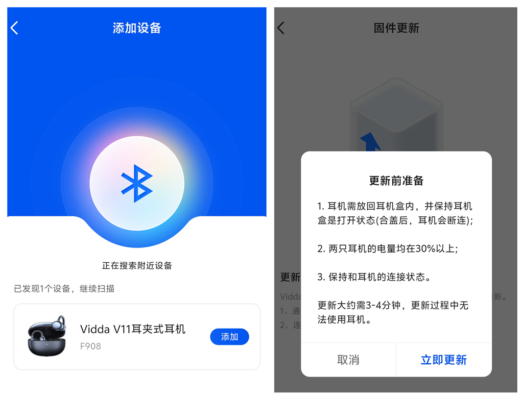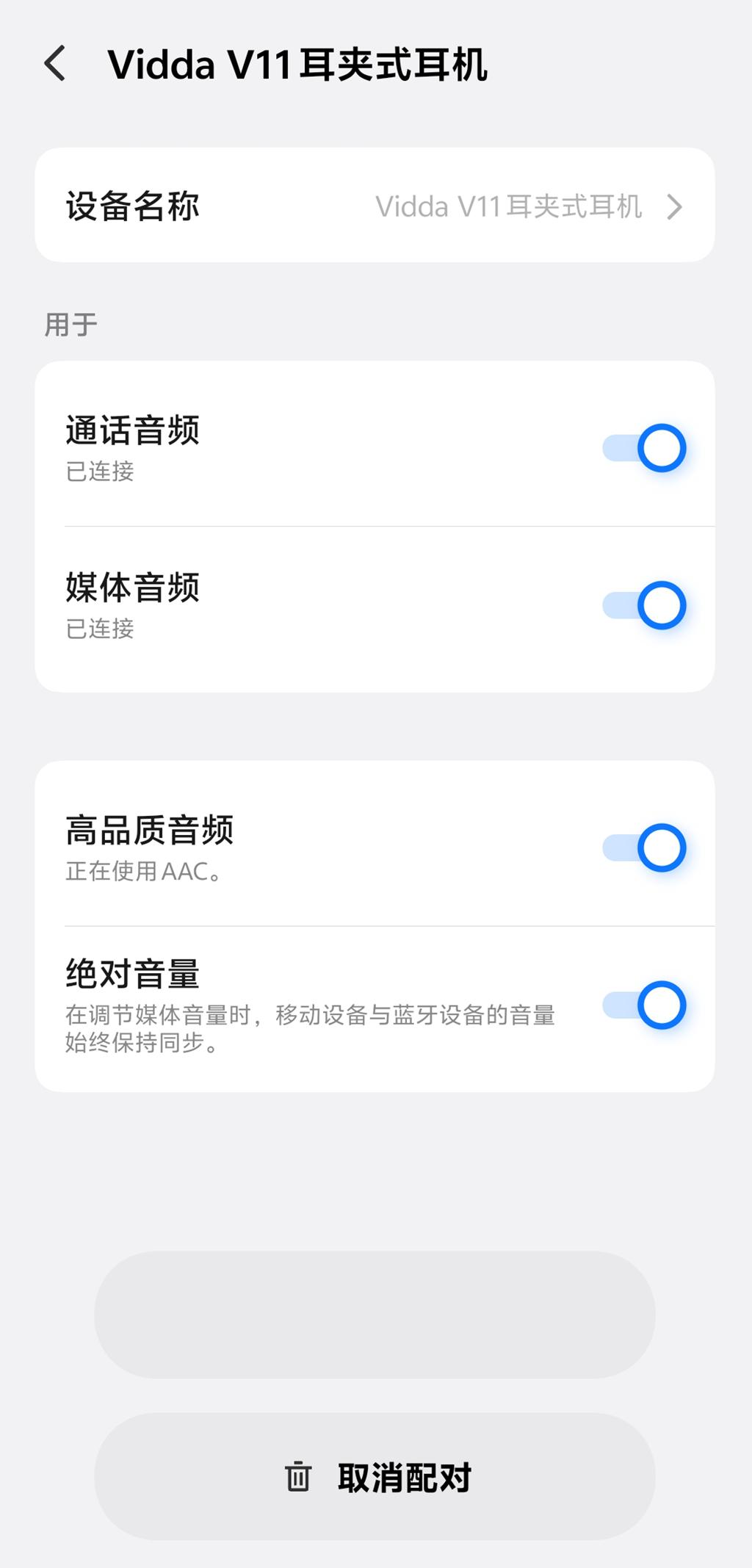连接体验堪称“秒连”,打开充电仓,手机蓝牙便迅速识别到“Vidda V11耳夹式耳机”,点击添加后瞬间完成配对,进入蓝牙设置页面,可清晰看到通话音频、媒体音频已同步连接,高品质音频模式默认开启AAC编码,为音质传输打下基础。