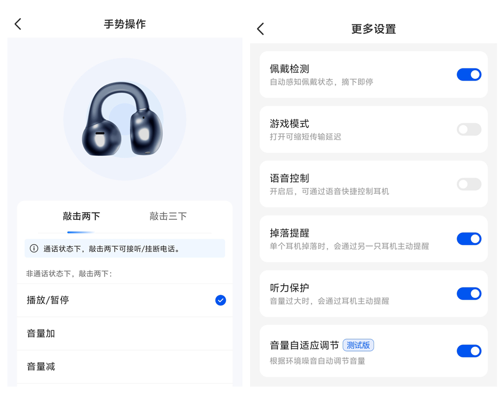便捷的手势操作与实用功能,让使用体验再升级。双击耳机可播放/暂停、接听挂断电话,三击可自定义音量调节,操作直观易上手。佩戴检测、掉落提醒、听力保护、音量自适应调节等功能一应俱全,春节户外嘈杂环境下,音量自适应调节能自动匹配环境音量,既保证听感,又守护听力。