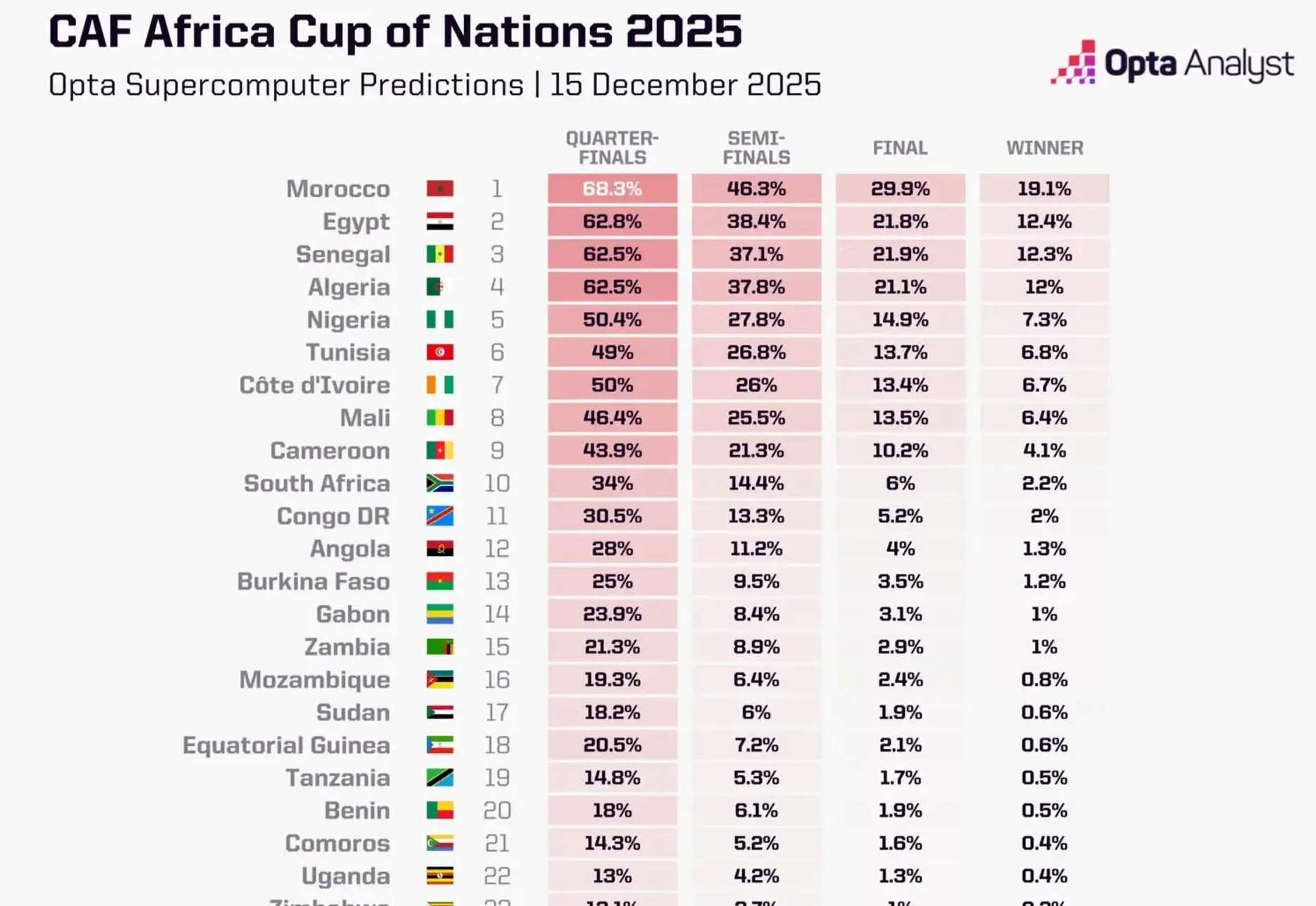 由于摩洛哥是本届非洲杯的东道主,而且是国际足联排名第11位的非洲头号强队,他们被看作是夺冠大热门。分在马里、赞比亚和科摩罗所在的小组,摩洛哥大概率能轻松出线,甚至有望一路闯进1月18日的决赛。而科特迪瓦和喀麦隆虽然同组竞争激烈,但凭借实力也大概率能晋级淘汰赛,至少能打到1月3日开始的16强。