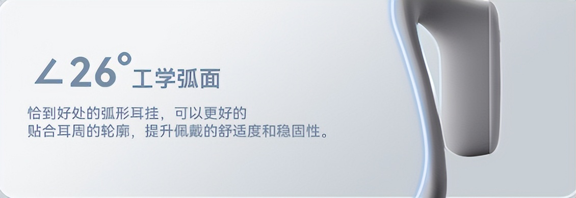 耳机的耳挂采用天鹅颈结构设计,可轻松适配眼镜,让戴眼镜的朋友也能舒适佩戴;同时单耳仅 9.5 克的轻量化设计,佩戴时可以减少了耳部的压迫感;耳机还支持 IPX4 防水,平时出汗或者遇到小雨,都不用怕会影响它使用。再加上黄金角度拐点设计,即便是长时间佩戴,也不容易出现酸痛问题,全方位兼顾舒适与实用性。