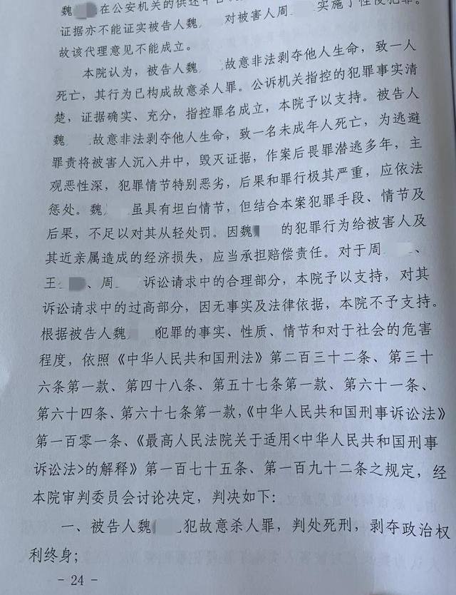 魏某把车开到了5公里外自家废弃的老宅。翻过斑驳的围墙时,小雨的身体已经冰凉。这个丧心病狂的男人又折返回家,拿来编织袋和砖块。脱掉女孩部分衣物后,他把这个14岁的生命连同书包一起沉入了6米深的井底。