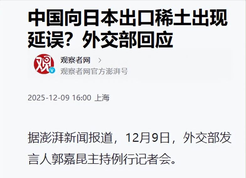 澎湃新闻,2025年12月9日,《中国向日本出口稀土出现延误?外交部回应》