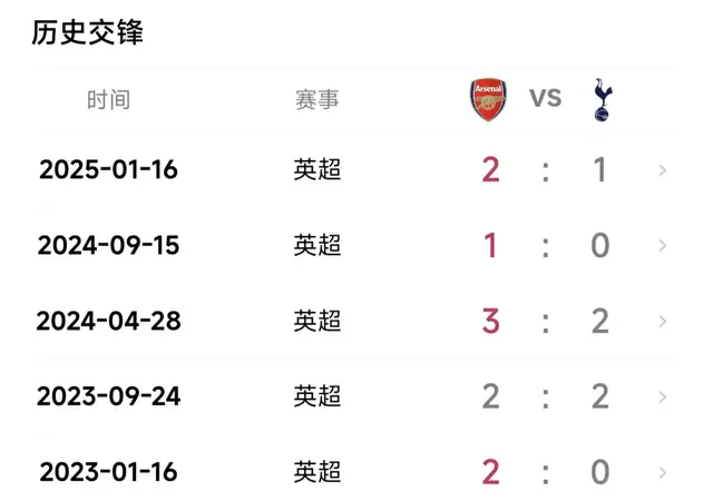 从最近五次英超北伦敦德比战况看,阿森纳在德比中占有优势。2025年1月16日阿森纳2-1战胜热刺,孙兴慜先进球,但阿森纳依靠角球和特罗萨德反超取胜;2024年9月15日阿森纳在客场1-0击败热刺,加布里埃尔头球破门;2024年4月28日阿森纳3-2客胜热刺,比赛精彩节奏激烈;2023年9月24日双方2-2战平,孙兴慜两度追平;2023年1月16日阿森纳客场2-0击败热刺。