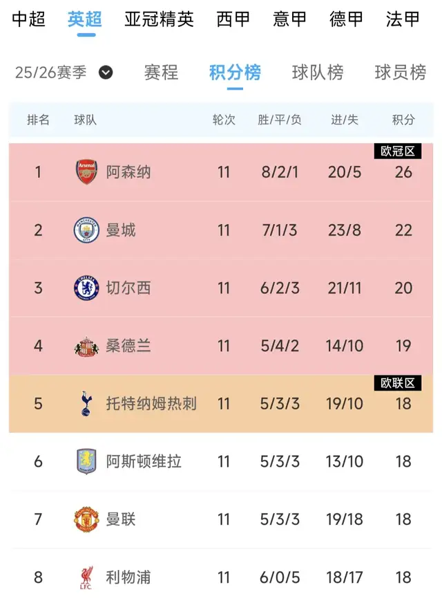 北京时间11月24日凌晨0:30,英超第12轮,阿森纳将坐镇主场迎战托特纳姆热刺队,上演北伦敦德比大战。阿森纳在新赛季开局表现出色,目前以26分的积分位列英超积分榜榜首,曼城22分第2,切尔西20分第3,桑德兰19分第4。在此之后,有5支队伍同积18分,分别是热刺、维拉、曼联、利物浦和伯恩茅斯。