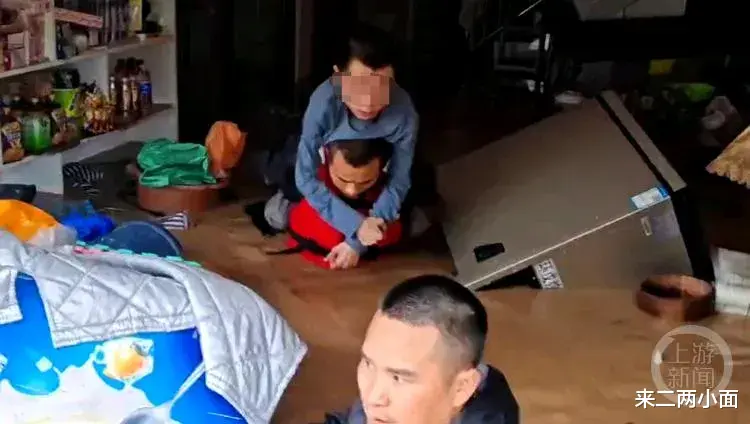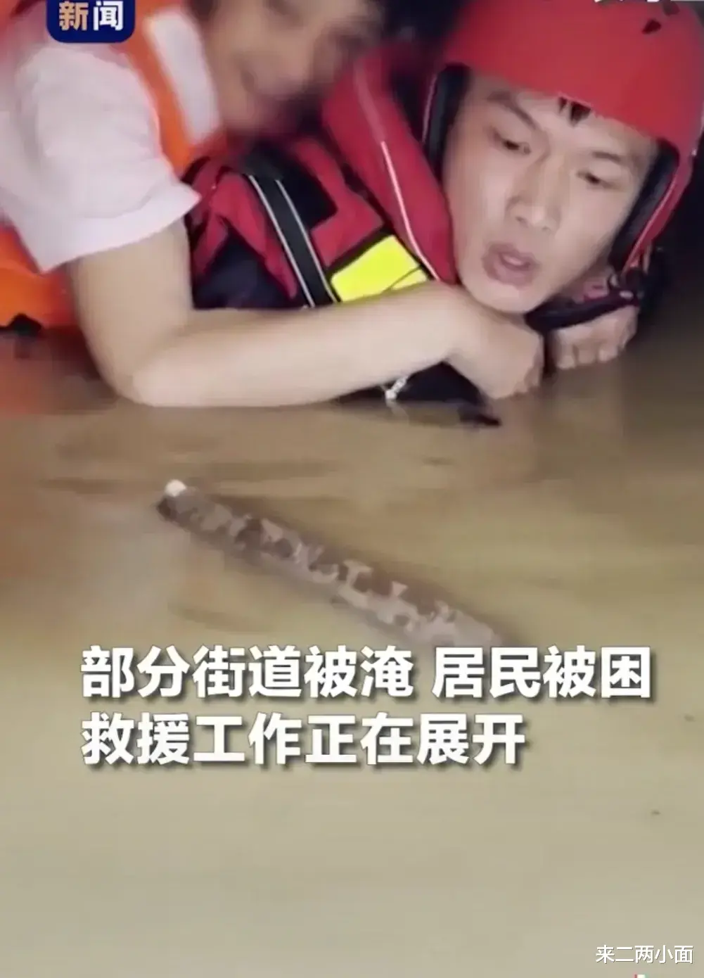 一楼的商户门市全部被淹,救援队淌着半人深的水正在救援被困人员