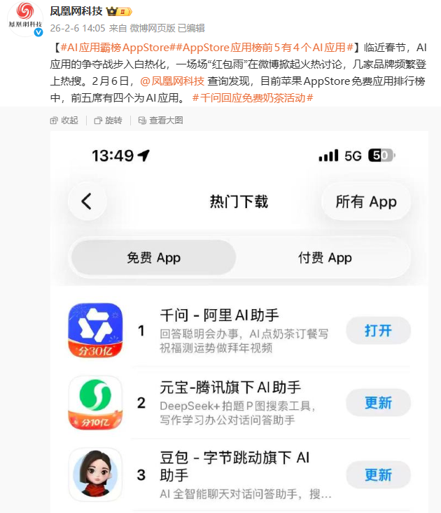 2026年2月6日消息,“千问免费送奶茶”冲上今日热搜榜,阿里千问宣布活动上线5小时,通过千问APP下单超过500万单。据凤凰网科技报道,目前,在苹果AppStore免费应用排行榜中,千问APP成功登顶,腾讯元宝位居第二,字节跳动豆包则降至第三名。自2025年4月7日,豆包长期位于免费榜第一,经历过阿里灵光、蚂蚁阿福以及腾讯元宝等AI应用,连番冲击榜首未果。