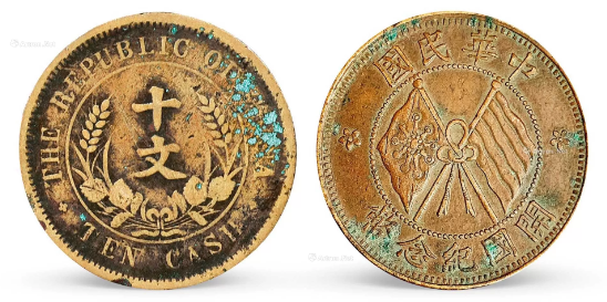 拍品描述:民国开国纪念币双旗十文铜元,是民国建立后首批发行的流通货币之一。正面中央为交叉的铁血十八星旗与五色旗,旗帜纹路清晰,珠圈环绕,上方 “中华民国” 四字端庄有力,下缘 “开国纪念币” 字样规整,见证了共和政体取代封建帝制的历史转折。背面以嘉禾纹环绕 “十文” 面值,外围英文 “THE REPUBLIC OF CHINA TEN CASH”,体现了当时币制的国际化表达。此币包浆斑驳,铜锈呈现自然的蓝绿色,文字与纹饰的核心细节完整,虽历经流通仍保持了较好的辨识度,属于流通币中的中上品。