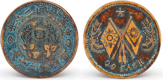 拍品描述:民国二十年河南省造当制钱二十文双旗币,属于民国中期地方铸币的典型代表。币面中央为嘉禾环绕的 “贰拾文” 字样,外环铸 “中华民国二十年” 及 “当制钱二十文”,铜质熟旧,蓝绿锈层深浅交织,包浆厚重且分布自然,字口与嘉禾纹路清晰,磨损均匀。币背以交叉的铁血十八星旗与青天白日满地红旗为核心,上方五角星标识版别,下方 “20 CASH” 英文字样规整,纹饰层次分明,旗帜细节与麦穗纹饰保存完好,铜色温润中透着红褐包浆,氧化状态自然。它诞生于 1931 年,当时河南地方政府为稳定金融秩序而铸行,是民国货币体系从混乱走向规范的实物见证。因存世量相对有限,且品相如此完整的较少,兼具历史研究与艺术收藏价值,近年在钱币市场颇受青睐,美品成交价稳步走高,是藏家研究民国地方铸币史的重要标本。