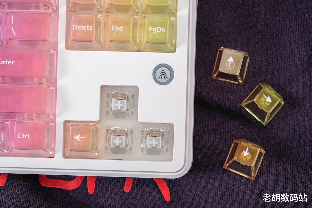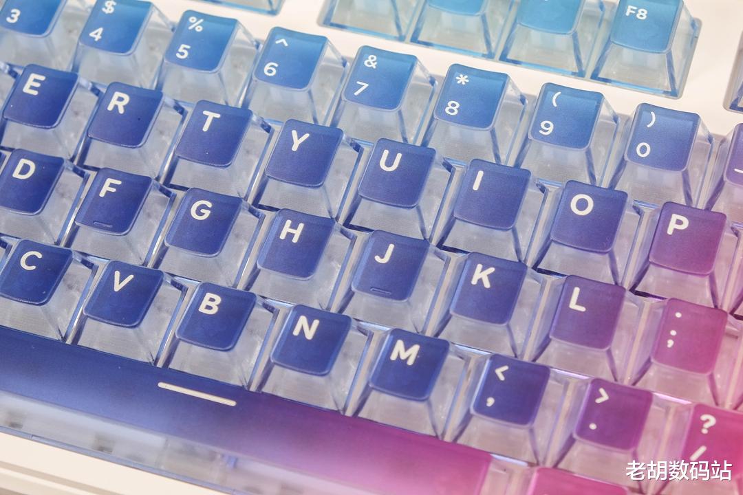 在材质选择上,黑爵做了明确区分:等高线白采用PBT材质,触感干爽且耐用;其余三款则选用PC透明材质,并经过微磨砂处理。这种设计不仅提供了出色的透光效果,呈现出晶莹剔透的视觉观感,同时有效避免了光面材质易沾指纹的问题。我手上的玻璃樽配色,在光线照射下如同真正的琥珀般流光溢彩,瞬间提升了整个桌面的格调。