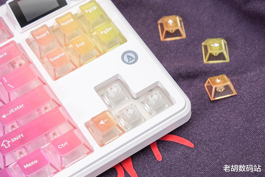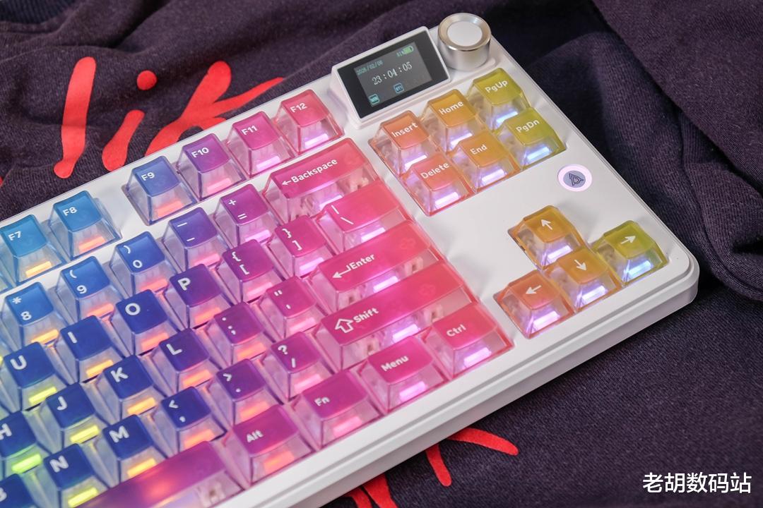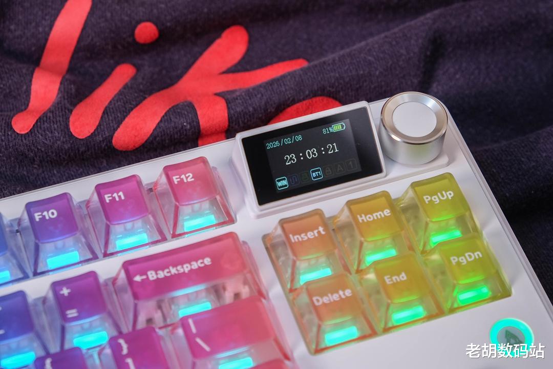 键盘右上角的可插拔TFT彩屏与金属音量旋钮组合是设计的精髓。旋钮质感出色,阻尼适中,滚动调节音量直观高效,一键静音非常便捷;旁边的彩色屏幕不仅能实时显示电量、连接状态等信息,更可通过驱动上传自定义动图,灯光选择、灯光效果、颜色等等,让键盘成为展现个性的窗口,在实用与趣味间取得了绝佳平衡。