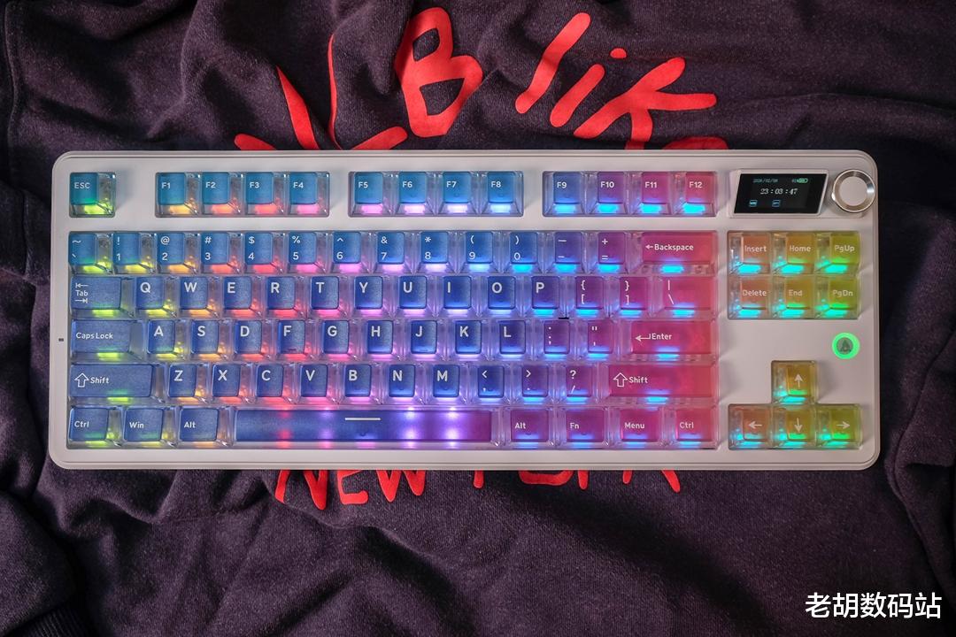 黑爵MK87 Pro的灯光系统非常出色,采用下灯位设计,拥有1600万色RGB背光,配合侧边流光灯带和内置9颗灯珠的空格键,光效均匀饱满。它支持音乐律动模式,灯光能随音乐节奏变化,搭配我这款透明键帽,光线在键帽内折射流转,营造出极具层次感的赛博光影,桌面氛围感直接拉满。