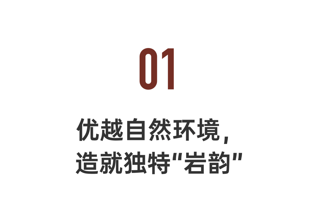 丹霞地貌的土壤,造就了岩茶独特的“岩韵”,也就是“岩骨花香”。“岩骨”,是土壤带来的特殊滋味,“花香”,是制作过程中产生的香气。总体来说,岩茶香气幽而清远,茶汤到口腔中润滑,回甘明显持久,有“臻山川精英秀气所钟,品具岩骨花香之胜”之说,滋味可以概括为“活、甘、清、香”。