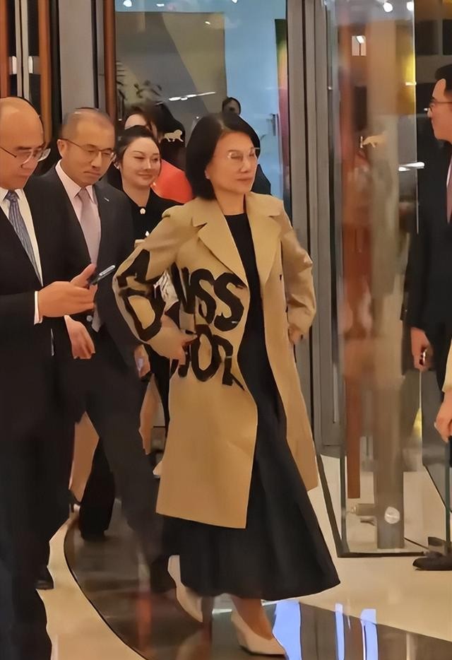 只见71岁的只见董明珠身着一件带有 Dior logo 的卡其色风衣。