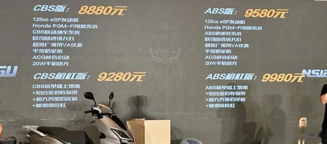 老规矩先看价格,NS125GU分四个版本上市:CBS版8880、CBS箱杠版9280元;ABS版9580、ABS箱杠版则为9980元。这个价格相比新大洲本田以往的125小踏板不算贵,毕竟合资本田的小踏板一向都不便宜,并且全新的这台NS125GU配置也非常高。