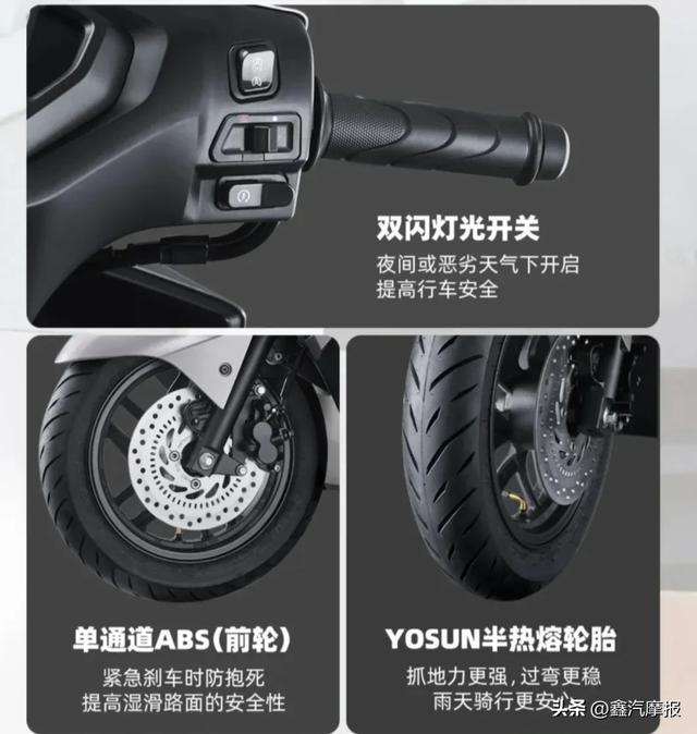 前面有提到此车的配置很高,比如配备了VA液晶仪表、USB充电接口、边撑熄火、脉冲点火、甚至还有发动机自动启停技术,在车辆启动运行时如果停下,进入怠速状态后就会自动熄火,但只要拧油门就会自动启动并前进,在市区走走停停的路段是有利于发动机的散热和节省油耗。并且此车还配备了前90/90-12后100/90-10尺寸的YOSUN半热熔高抓胎,风冷125就配备半热熔可是非常难得。