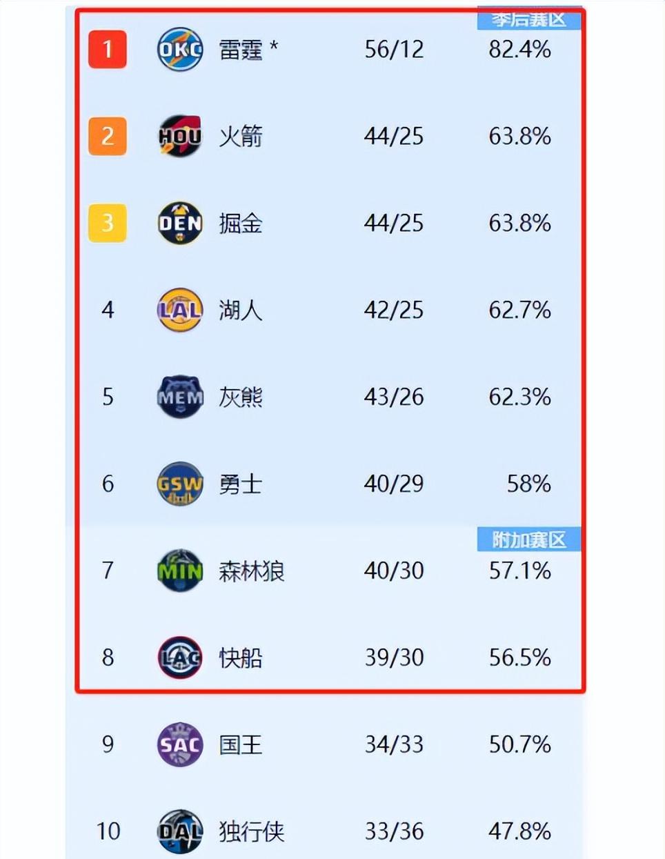 随着勇士和快船的双双获胜,西部的排名格局也逐渐清晰起来了。目前西部前8的排名基本确定,依次是雷霆、火箭、掘金、湖人、灰熊、勇士、森林狼和快船。排名第8的快船队已经领先第9的国王队4个胜场,差距还是挺大的,国王队参加附加赛的可能性很大。由于西部前6名将直接晋级季后赛,快船队、森林狼队以及勇士队等强队,接下来肯定会为了西部第6的位置展开激烈竞争。
