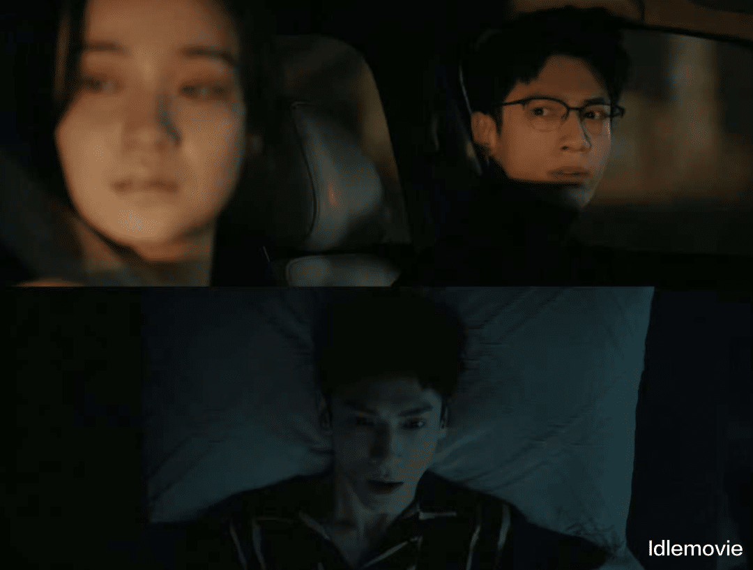 齐思哲载着女友突遇车祸,神秘人扔下打火机引爆汽车,齐思哲从梦中惊醒,一脸惊恐。