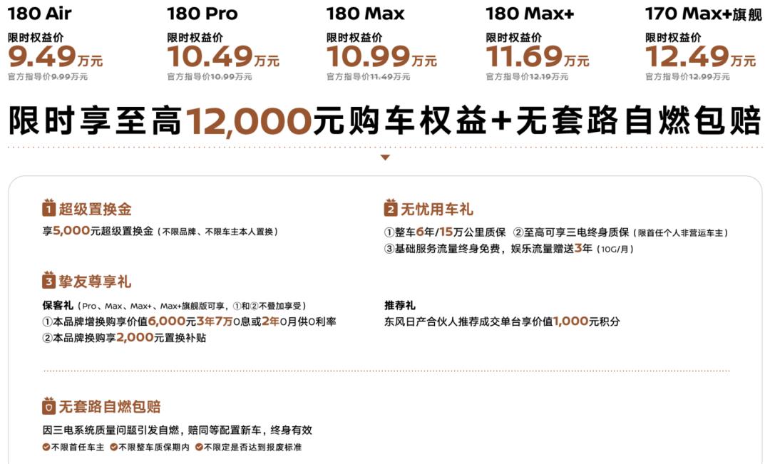 而在11月,比亚迪宣布秦L DM-i荣耀版降价5000元,直接下探至9.28万元,而银河A7那边8.98万元起的价格,还带来了“终身免费基础保养”政策。那么东风日产N6能撬动市场份额吗?