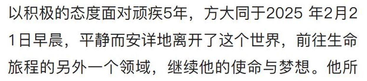 方大同去世的消息传出来后,很多歌迷都在微博上表达哀思。他最后一条微博发在2月13号,那时候他的身材已经明显瘦了很多。他在微博里给歌迷拜年,还高兴地说他的新歌《那沙漠里的水》MV已经上线了,并感谢导演的才华,让这个可爱的MV得以呈现。但现在这一切都成了回忆,歌迷们感到非常不舍。