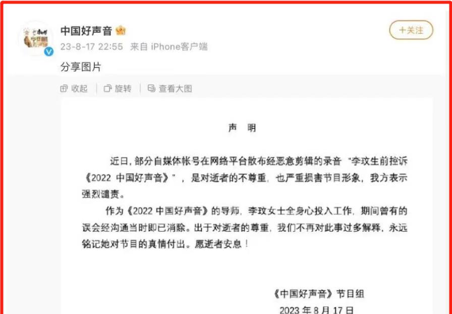 李玟的录音及视频一曝光,很快《中国好声音》来了声明,表示部分自媒体散布恶意剪辑的录音“李玟生前控诉《2022中国好声音》”是对逝者的不尊重、严重损害节目形象,强烈谴责;李玟曾为好声音导师,之前有误会,但已消除,云云。