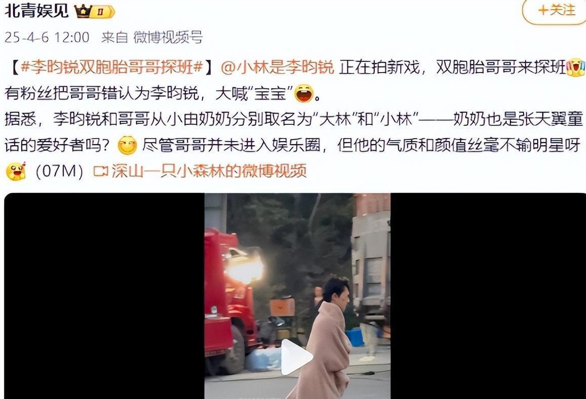 在李昀锐的身后,也有个“守护神”,始终在他身边,替他解难排忧。4月6号,李昀锐在拍《冰湖重生》,他的双胞胎哥哥大林到剧组探班,结果现场的粉丝竟然把他认成李昀锐了。粉丝们真是厉害,凭着自己的热情把李昀锐送上了头条。只见大林戴着顶黑色棒球帽,身高和体型跟小林差不多。