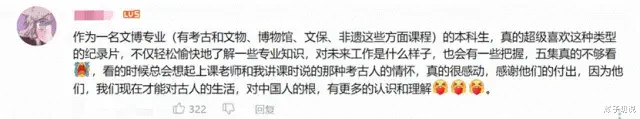 在B站的口碑纪录片《不止考古·我与三星堆》的评论区,有位家长分享,和自己五岁的女儿一起观看了这部纪录片,看完这部作品之后,女儿说将来想去考古。也有一位高三的学生,在作品的评论区里询问,想加入三星堆成为考古人,应该学习什么专业。甚至有已经是文博专业的本科生,说因为这部作品,了解一些专业知识,对未来的工作有了一些把握。