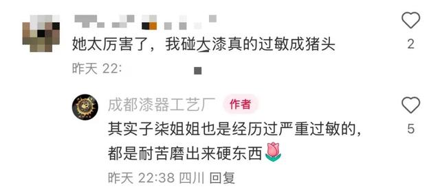 成都漆器工艺厂还回复网友称:“其实李子柒也是经历过严重过敏的,都是耐苦磨出来硬东西。”