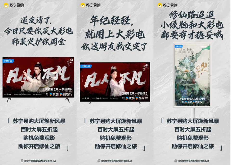 提升用户观影体验,818苏宁易购发起“大屏焕新风暴”,与彩电头部品牌及优酷合作。活动期间,百吋大屏5折起,购机加赠优酷影视会员,加码《凡人修仙传》观影特权,解决消费者“有硬件无内容”的痛点,闭环产品到场景的消费体验。